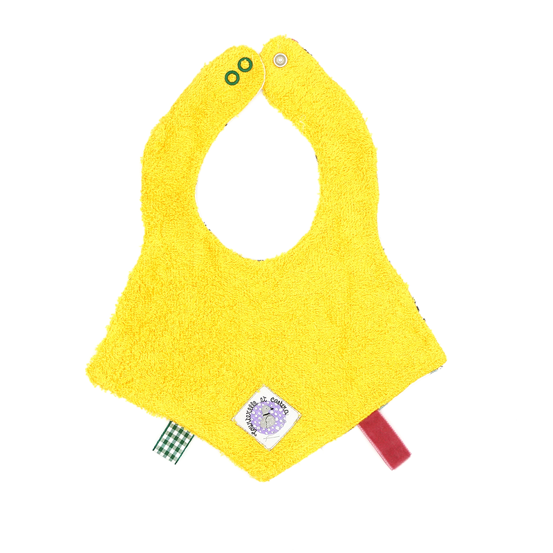 Petit bavoir pour les premières tétées et la percée des dents. Deux niveaux de fermeture suivant le cou du petit enfant et permettant de porter le bavoir sur un vêtement épais. Trois barrettes sensorielles. Fermeture par pressions